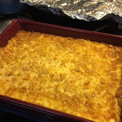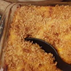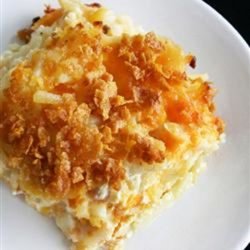 2Mix hash brown potatoes, sour cream, onion, cream of chicken soup, Colby cheese, and melted butter in a bowl; season to taste with salt and black pepper. Transfer mixture into a 9x13-inch baking dish and sprinkle top with corn flake crumbs.
