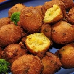3Drop ping pong ball-sized balls of batter, about 5 at a time, into the hot oil. Fry until golden brown, about 5 minutes. Remove hush puppies with a slotted spoon and drain on a paper towel-lined plate. Repeat with remaining batter.