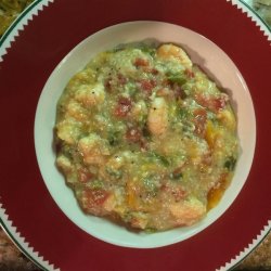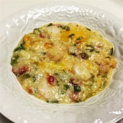 4Stir the Monterey Jack cheese, 3/4 cup Cheddar cheese, shrimp and vegetable mixture, canned tomatoes, and black pepper into the grits; pour into prepared baking dish and sprinkle with remaining 1/4 cup Cheddar cheese.