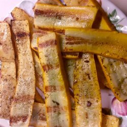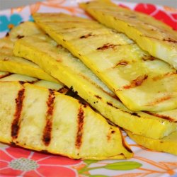 2Cut the squash horizontally into 1/4 inch to 1/2 inch thick slices so that you have nice long strips that won't fall through the grill.