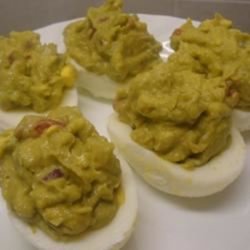 1Place eggs in a saucepan and cover with cold water. Bring water to a boil and immediately remove from heat. Cover, and let eggs stand in hot water for 10 to 12 minutes. Remove from hot water, cool, and peel. Slice eggs in half, and remove yolks to a mixing bowl.