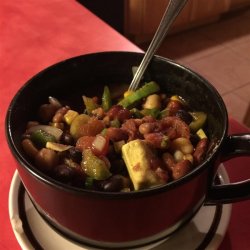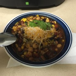 1In a slow cooker, combine black bean soup, kidney beans, garbanzo beans, baked beans, tomatoes, corn, onion, bell pepper and celery. Season with garlic, chili powder, parsley, oregano and basil. Cook for at least two hours on High.