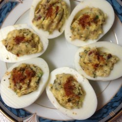 4Arrange egg whites cut-side-up on a serving platter. Spoon about 1 rounded tablespoon yolk mixture into each egg white half; sprinkle with crumbled bacon.