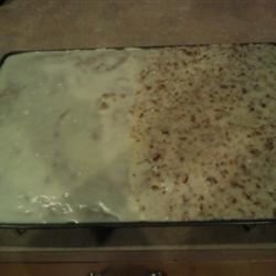 7To make icing, place 1/2 cup of butter and the milk into a saucepan, and bring to a boil over medium-low heat. Remove from the heat, and beat in the confectioners' sugar, chopped pecans, and vanilla extract. Ice the cooled cake with the warm frosting.