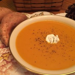 2Melt butter in a large pot over medium heat. Add onion and garlic, and cook for about 5 minutes, until softened. Add sweet potatoes, and chicken stock. Season with cumin, chili flakes and ginger. Bring to a boil. Reduce heat to low, cover, and simmer for 15 minutes, until potatoes are tender.