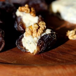 2Cut a slit into each date so they can be spread flat. Spread cheese mixture into each date; top with a walnut piece.