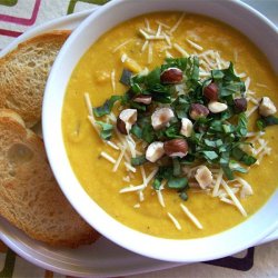 2Melt the butter in a large pot over medium heat. Add the onion, leek and garlic, and saute for a few minutes, until tender. Pour the chicken broth into the pot. Add the potatoes, and bring to a boil. Cook for about 20 minutes, or until soft. Add the squash, and mash with the potatoes until chunks are small. Use an immersible hand blender to puree the soup, or transfer to a blender or food processor in batches, and puree until smooth. Return to the pot.