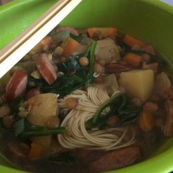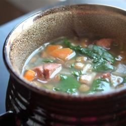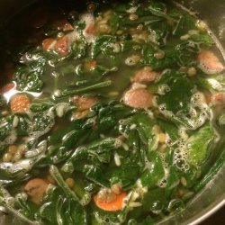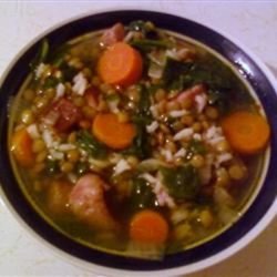 "Turkey kielbasa, spinach, and lentils are combined to yield a hearty soup."