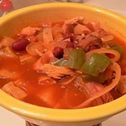 1Place a heavy pot over high heat. Add the onion and bell pepper; cook 2 to 3 minutes without stirring until browned. Immediately pour in the chicken stock, and stir to release vegetables from the bottom of the pot. Reduce heat to low. Stir in the garlic, turkey, salsa, vegetable juice, hot pepper sauce, and lime juice. Simmer over medium heat until heated through, about 15 minutes. Season to taste with salt and pepper.