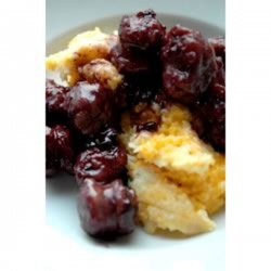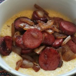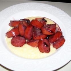 2Heat the olive oil in a large skillet over medium heat. Add the sausage, mushrooms and onion; cook and stir until browned. Stir in the preserves, and simmer until sausage and mushrooms are coated and sauce is smooth, about 5 minutes. Serve over cheese grits.
