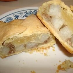 2Arrange layer of potatoes on half of each pastry square, top with layer of onion and then with meat. Sprinkle with salt and pepper and dot with butter.