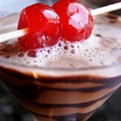 1Fill a cocktail shaker with ice cubes. Pour in chocolate and cherry vodkas, grenadine, creme de cacao, half-and-half, and chocolate syrup. Cover and shake until the outside of the shaker has frosted. Strain into a chilled martini glass, garnish with maraschino cherry and chocolate kiss, and serve.