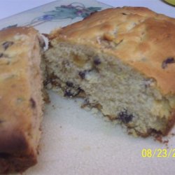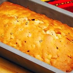 2In a large bowl, cream the butter with the sugar and honey. Beat in the egg, then the cream or milk, rum, and vanilla. Stir together the remaining 1 1/2 cups flour and the baking powder; beat into the creamed mixture. Stir in the fruits and nuts. Turn the batter into a greased and floured 9 x 5 inch loaf pan.