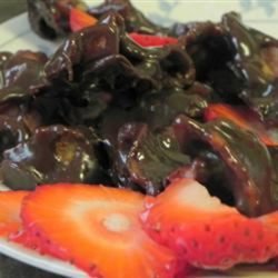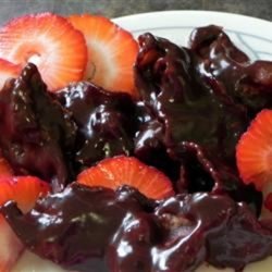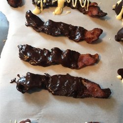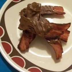 2Melt the chocolate in a microwave-safe glass or ceramic bowl in 30 second intervals, stirring after each melting, for 1 to 3 minutes (depending on your microwave). Do not overheat or chocolate will scorch. Dip all but the last inch of each strip of bacon in the melted chocolate. Place bacon on waxed paper and allow to cool and harden before serving.