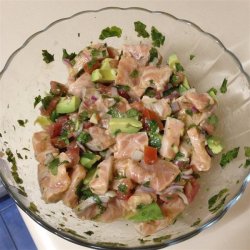 "Thin slices of salmon lounge in a citrus, cilantro and garlic marinade for four hours before being served with chips, rice or tortillas. Fresh ingredients are what makes this simple, easy dish amazing. The hardest part of it is the slicing and dicing. With minimal effort and no cooking you'll get rave reviews. This can just as easily pass for an appetizer in smaller portions."
