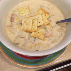 2Meanwhile, melt the butter in a large pot over medium-low heat. Whisk in the flour, and cook for 5 minutes, stirring constantly. Slowly whisk in the milk, and bring to a simmer over medium-high heat. Once simmering, cook for 5 minutes, whisking frequently. Add the bacon, cooked vegetables, potatoes, and corn. Return to a simmer, then reduce heat to medium-low, and cook until the potatoes are tender, about 20 minutes more. Use additional milk as needed to to achieve desired consistency. Garnish with paprika to serve.