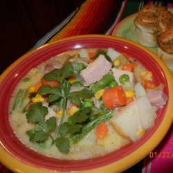 2Bring mixed vegetables, potato, water, and onion to a boil in a large pot; reduce heat to medium and simmer until potatoes begin to soften, 12 to 15 minutes. Stir in cream-style corn, whole kernel corn, cream of mushroom soup, milk, half-and-half, bacon, and ham. Continue to simmer until potatoes are completely tender, about 5 minutes more.