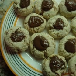 4While the cookies are baking, melt the chocolate chips in a small saucepan over low heat, or in the microwave. Stir chips until smooth. When cookies come out of the oven, spoon 1/2 teaspoon of the melted chocolate into the indentation. When cookies are completely cool, dust lightly with confectioners' sugar.