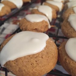 2In a medium bowl, cream together the 1/2 cup of butter and white sugar. Add pumpkin, egg, and 1 teaspoon vanilla to butter mixture, and beat until creamy. Mix in dry ingredients. Drop on cookie sheet by tablespoonfuls; flatten slightly.