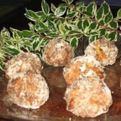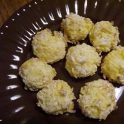 2In a medium bowl, mix together the coconut, sugar and egg yolks to form a stiff dough. Squeeze into 1 inch balls, and roll each ball in flour to coat. Place on a baking sheet, spacing about 2 inches apart.