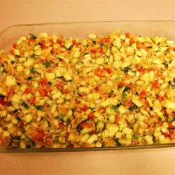 2In a small bowl combine stuffing and butter. In a separate bowl combine zucchini, carrots, onion, soup and sour cream. Mix in 1/2 of the stuffing mixture, then spread into a 9x12 inch casserole dish and sprinkle the remaining stuffing on top.