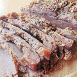 "Spicy and smoky beef brisket. My version has no BBQ sauce added. Keep the dish tightly covered during cooking and don't peek. This prevents the brisket from drying out. If you use a larger or smaller brisket, adjust the cooking time to 1 hour per pound. Cut the brisket against the grain with a sharp knife, or it will be stringy."