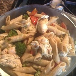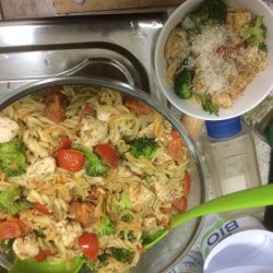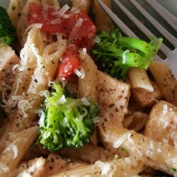 "A mixture of pasta, broccoli, pesto, tomatoes and cheese that is practically a meal in itself, especially with the cooked chicken. Great served with crusty bread or a tossed salad. Try using bow tie pasta for an added variation!"