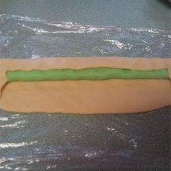 3Divide the pastry into 10 portions. Using a rolling pin, roll each portion into long strips measuring about 4x12 inches. Divide the almond paste mixture into 10 portions; use your hands to form each portion into a snake shape. Place each almond 'snake' into the center of each pastry strip. Fold the dough over and seal the seam, also closing the ends. A little water will help to hold the seal. Arrange the rolls seam side down onto the baking sheets. Cut slits into the rolls with scissors every 2 inches.