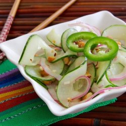 3Drizzle dressing over onion and cucumbers; mix gently to combine. Garnish with peanuts and jalapeno pepper.