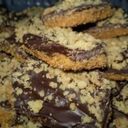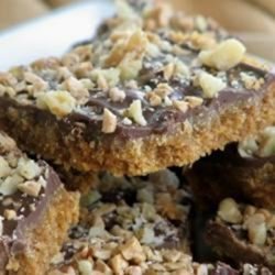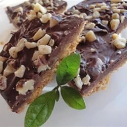 4Bake for 10 more minutes. Remove from oven, and sprinkle with chocolate chips. Let stand for 2 to 3 minutes, until chips are shiny and soft. Spread the softened chocolate evenly over the top. Sprinkle with chopped nuts. Cool before cutting into bars.