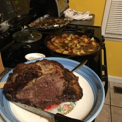 3Heat an 11-inch cast-iron skillet over medium-high heat until skillet is very hot. Brown standing rib roast on all sides in the hot skillet, 3 to 5 minutes per side. Remove meat from skillet. Cook and stir carrots, celery, and onions in the hot skillet until slightly browned; stir beef broth into vegetables. Place roast on top of vegetables in skillet.