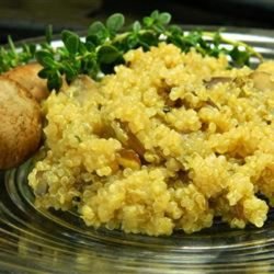 1Heat a large saucepan over medium heat and swirl olive oil around the inside of the pan to coat. Cook shallot in the hot oil until translucent, about 3 minutes; stir in cremini mushrooms, cooking and stirring until mushrooms are browned, 8 to 10 minutes. Stir quinoa, thyme, bay leaf, kosher salt, and black pepper into mushroom mixture. Cook, stirring often, until quinoa gives off a slightly toasted fragrance, about 5 minutes.