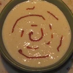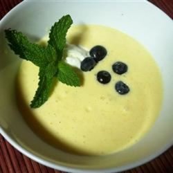 "A refreshing cool and creamy soup made with mango. You may add blueberries or sliced strawberries as a garnish when in season. Fat free sour cream may be substituted for the half-and-half cream."