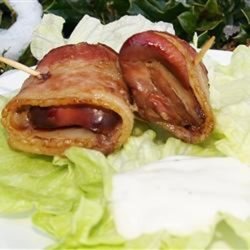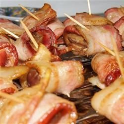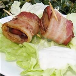 "This traditional hot appetizer is always a crowd pleaser. Chicken livers and water chestnuts are marinated in a simple, savory sauce, then wrapped with bacon and fried."