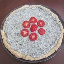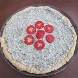 "This is a pizza bread crust slathered with spinach dip and covered with scrumptious toppings: broccoli, chicken or turkey, green onions, and tomato."