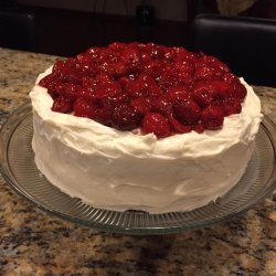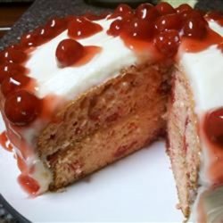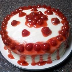 "A double-layer cake made with cherry pie filling, topped with cream cheese frosting and cherry pie filling. Very moist and dense and cherry-licious. You can also put it in a 9 x 13 inch pan if you don't want to store the two layer cake"