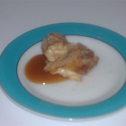 2In a separate bowl, mix together 1/3 cup of white sugar, 1 teaspoon of cinnamon and cream cheese until smooth. Mix in the vanilla and caramel ice cream topping, then fold in the apples. Lay out the egg roll wrappers on a clean surface. Place 3 tablespoons of filling onto the center of each one. Mix together the cornstarch and water; brush the edges of the egg roll wrappers. Roll up according to package directions.