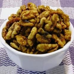 1Bring a pot of water to a boil, and stir in half the walnuts; reduce heat to medium, and boil for 1 minute. Remove nuts with a slotted spoon, and let drain in a colander set in the sink. Repeat with remaining walnuts. Rinse the walnuts under hot water, and transfer to a mixing bowl. Toss the walnuts with the sugar.