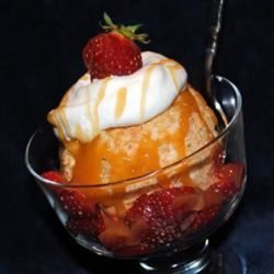 2Meanwhile, beat the whipping cream until soft peaks form. To serve, place 1/2 cup strawberries on 6 plates. Remove foil from the ice cream balls and place one on each plate. Top with caramel sauce and whipped cream.