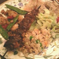 4Lightly oil the grill grate. Thread chicken onto skewers, and discard marinade. Grill skewers about 5 minutes per side, until chicken juices run clear. Serve with the peanut sauce.
