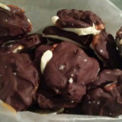 4Cook and stir chocolate chips in a saucepan over medium-low heat until melted and smooth, about 5 minutes. Remove from heat. Dip cooled caramels in the melted chocolate; return to greased baking sheet. Cool until chocolate is set.