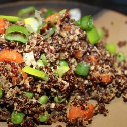 3Heat 1 1/2 teaspoons oil in a large skillet over high heat; saute carrots and onion for 2 minutes. Add 2 scallions, garlic, and ginger; saute until fragrant, about 2 minutes more. Add the remaining 1 1/2 teaspoons oil and quinoa; cook until heated through, about 2 minutes.