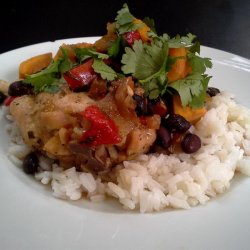1Heat the olive oil in a large skillet; season the chicken thighs with salt and pepper. Sprinkle 1/4 cup cilantro over the chicken thighs; brown the chicken in the frying pan, 3 to 5 minutes each side.