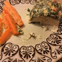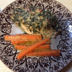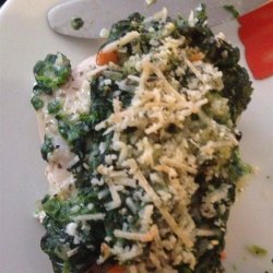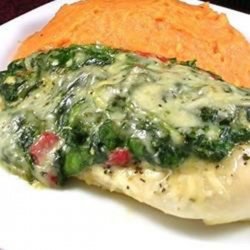 3In a small saucepan, saute green onion in butter/margarine until tender. Stir in flour, then add milk all at once. Simmer, stirring, until bubbly. Stir in drained spinach and pimiento and mix together. Spoon spinach mixture over chicken and sprinkle with remaining cheese mixture. Bake uncovered for 30 to 35 minutes or until tender and chicken juices run clear.