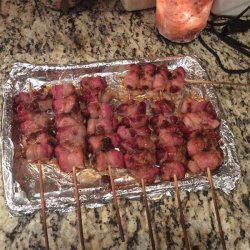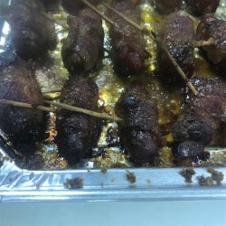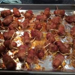 2Cut bacon into thirds and wrap each strip around a little sausage. Place the wrapped sausages on wooden skewers, several to a skewer. Arrange the skewers on a baking sheet and sprinkle them liberally with brown sugar.