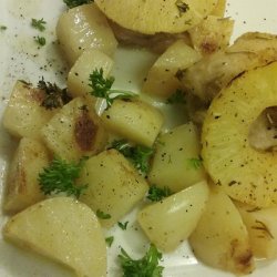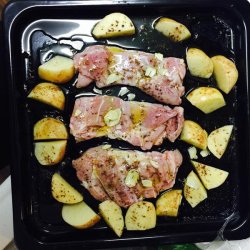 2Place chicken and potatoes in a large baking dish. Season generously with salt and white pepper.