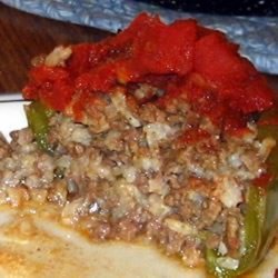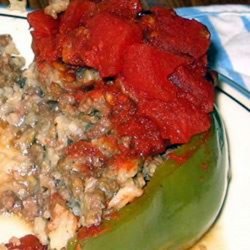 2In a skillet over medium heat, saute 1 chopped onion until tender. In a large bowl, combine ground beef, sauteed onion, cooked rice and eggs. Season with parsley, salt and pepper. Mix well, and stuff into peppers. Place in a large roasting pan.