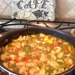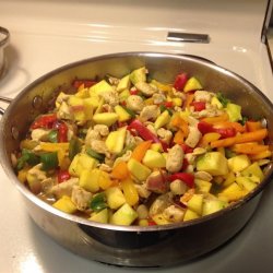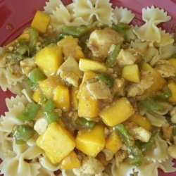 2Using the same skillet, cook and stir the onion over medium heat until the onion has softened and turned translucent, about 5 minutes. Stir in the green and red bell peppers and cook for 2 minutes, then add the ginger and cook for another minute. Stir in the chicken stock mixture and the cooked chicken breast. Cook until the sauce has thickened. Drop mango in and cook until the mango is heated through.
