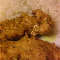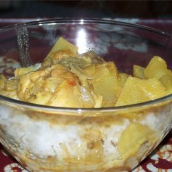 "Chicken curry with ginger, garlic, coconut milk, yogurt and potatoes. Malaysian in taste, deep brown in color, and since it simmers with the potatoes it makes for a complete dish! Serve with hot cooked rice and other veggies, if desired."
