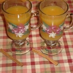1Peel the skin from the orange leaving the bitter white pith behind. Stick the cloves into the skin. Squeeze the juice from the orange and add to the 2-3/4 cups orange juice. Place all ingredients into a large nonreactive pan and bring to a boil over high heat. Remove from heat, cover and allow to stand at least 30 minutes to allow flavors to blend. Serve warm or cold.